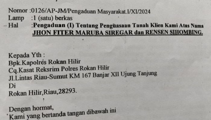 Eks anggota DPRD Rokan Hilir dilaporkan Keluarga Sitompul ke Polres Rohil, pada tanggal 18 November 2024, dengan nomor: 0126/AP-JM/Pengaduan Masyarakat.I/XI/2024.