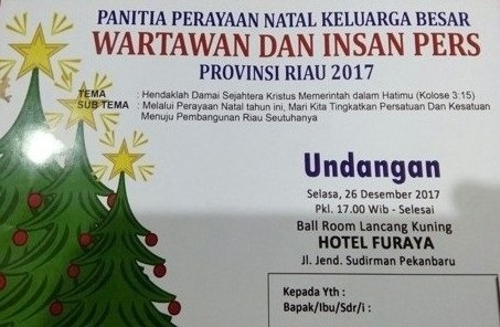 IMG-20171215-WA0103RIAU,WARTAPENARIAU.com-Ibadah perayaan Natal Wartawan dan Insan Pers Provinsi Riau tahun 2017, akan dilaksanakan pada hari Selasa, 26 Desember 2017, bertempat di Ball Room Lancang Kuning, Hotel Furaya Pekanbaru.