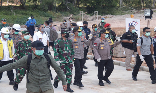 JAKARTA,WARTAPENARIAU.com-Panglima TNI Marsekal Hadi Tjahjanto bersama Kapolri Jenderal Idham Azis melakukan kunjungan kerja untuk meninjau progres pembangunan RS khusus penyakit menular yang diperuntukan bagi pasien Covid-19 di Pulau Galang, Kepulauan Riau, Rabu (25/3/2020).