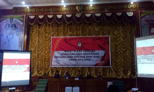 DUMAI,WARTAPENARIAU.com-Rapat pleno terbuka rekapitulasi hasil penghitungan perolehan suara pemilihan umum tahun 2019 tingkat kota Dumai ditetapkan, Senin (6/5/2019). Rapat pleno tersebut dihadiri oleh ketua KPU kota Dumai beserta anggota, ketua Bawaslu kota Dumai Zulfan,ST beserta anggota serta saksi-saksi partai politik.