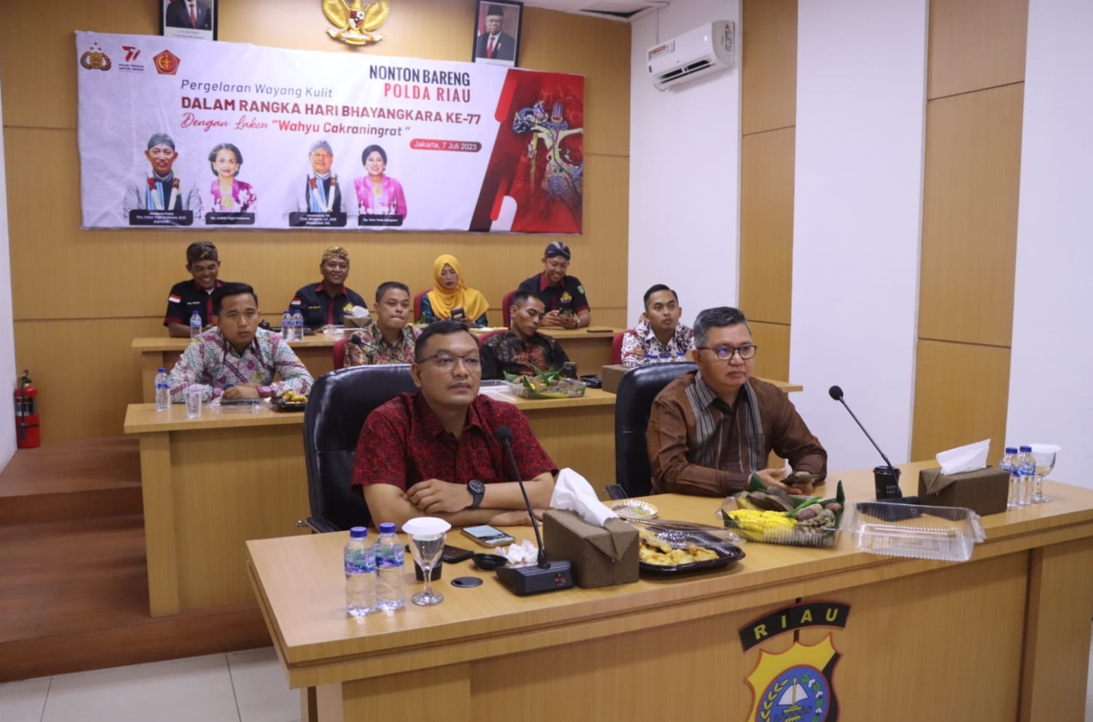 Kegiatan nonton bareng wayang kulit gelaran Mabes Polri yang merupakan rangkaian Hari Bhayangkara Ke – 77 Tahun 2023 berlangsung di Ruang Command Center Lantai II Polres Dumai Jalan Jendral Sudirman No. 01 Kelurahan Buluh Kasap Kecamatan Dumai Timur, Jumat (7/7/2023) malam.