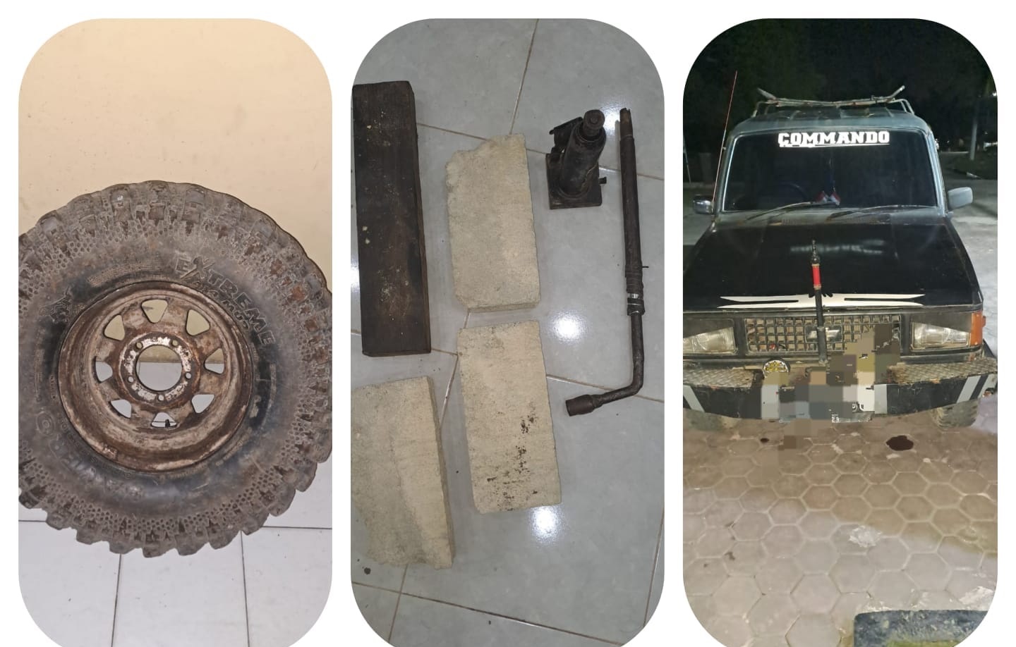 Bersama kedua pelaku, turut diamankan barang bukti berupa satu unit ban mobil beserta velgnya yang merupakan hasil curian, tiga buah batako warna putih, satu potongan broti , satu unit mobil merk Isuzu Troper dengan Nomor Polisi (Nopol) BK 1774 BG, satu unit kunci roda dan satu buah dongkrak.