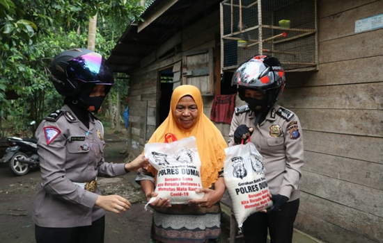 Para Srikandi jajaran Polres Dumai tampak menyalurkan bantuan sembako kepada masyarakat diwilayah Kecamatan Bukit Kapur dengan mengendarai sepeda dan sepeda motor melintasi kondisi jalan yang sulit dilalui serta licin.