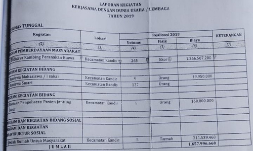 “Pengguliran Kambing Etawa dilaporkan pada tahun 2019, dalam laporan itu dituliskan bahwa pengguliran kambing terealisasikan pada tahun 2018 sebanyak 265 ekor dengan nilai materi berjumlah Rp 1.266.507.200,”ungkap Arif, (bukan nama sebenarnya.red) seraya menyerahkan Bundelan yang berisikan catatan penyaluran CSR beberapa Perusahaan yang ada di wilayah Kabupaten Siak.